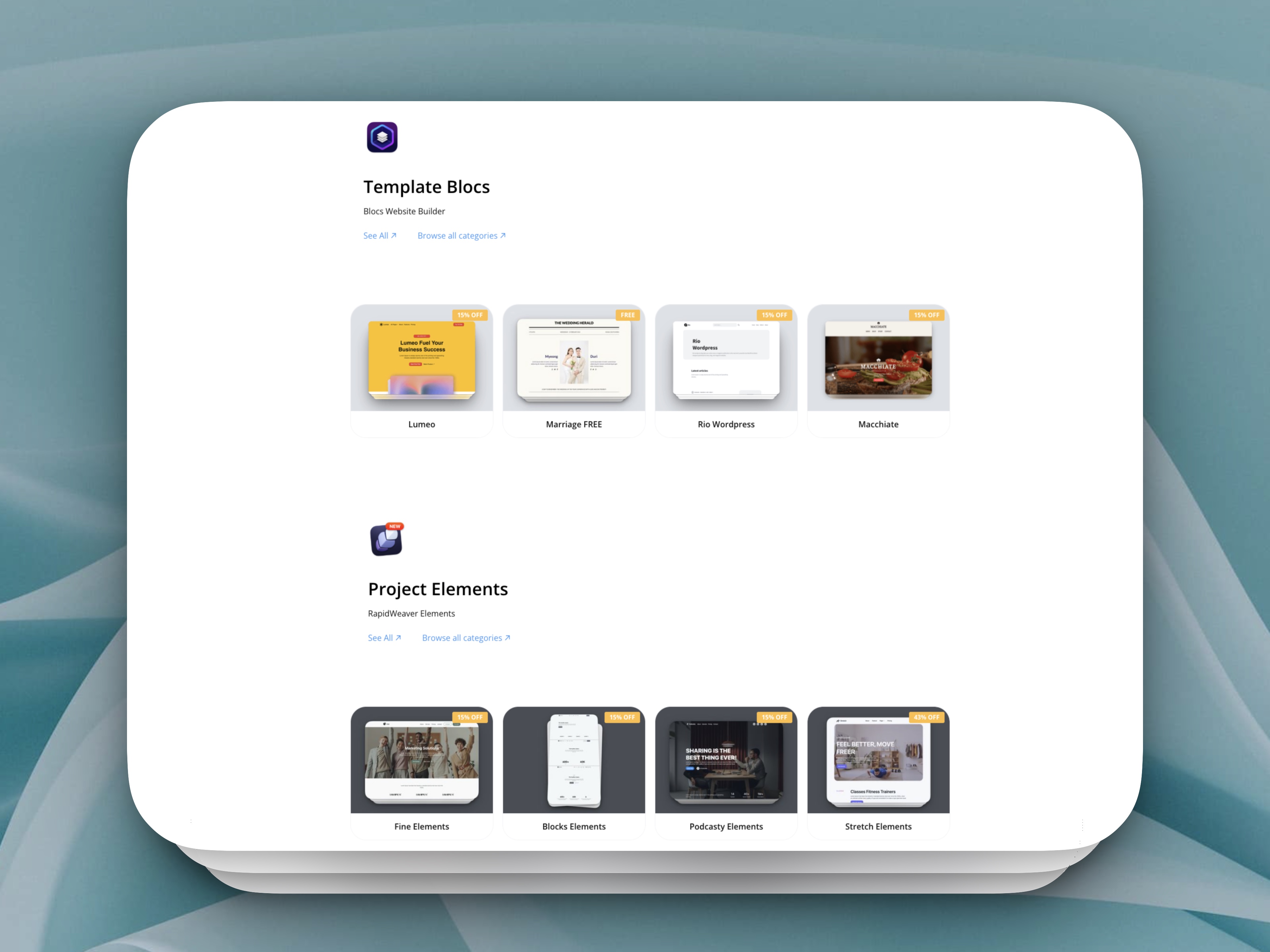 - Better Organized Categories: Whether you’re browsing Blocs templates or RapidWeaver Elements, everything is sorted into clearer, more logical categories to speed up your search.